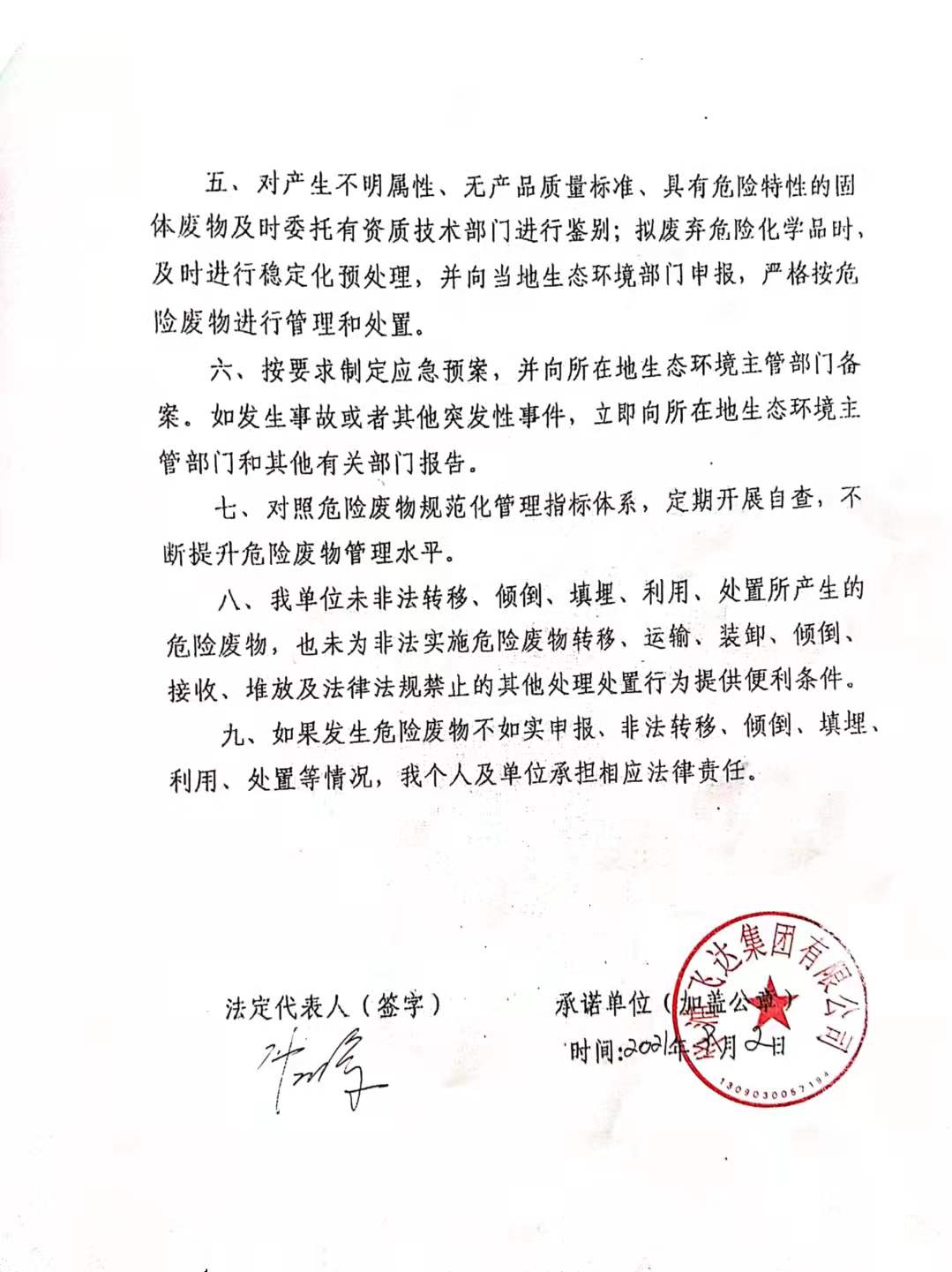 2021年9月3日危險廢物污染環(huán)境防治主體責(zé)任承諾書